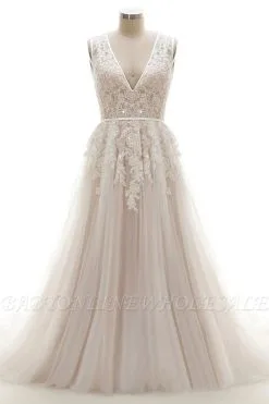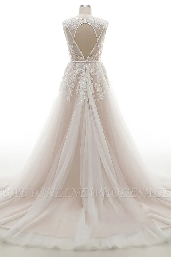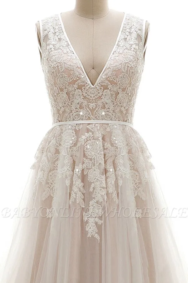 V-Neck A-line Wedding Dress Sleeveless Tulle Lace Appliques Bridal Dress