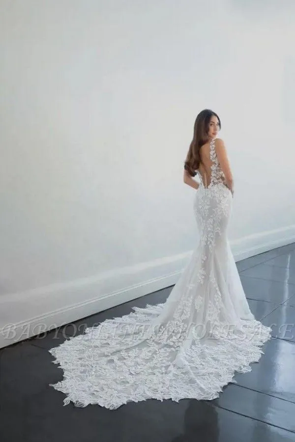 | product name | Exquisite Floor Length Deep V-Neck Sleeveless Mermaid Lace Wedding Dress with Chapel Train |