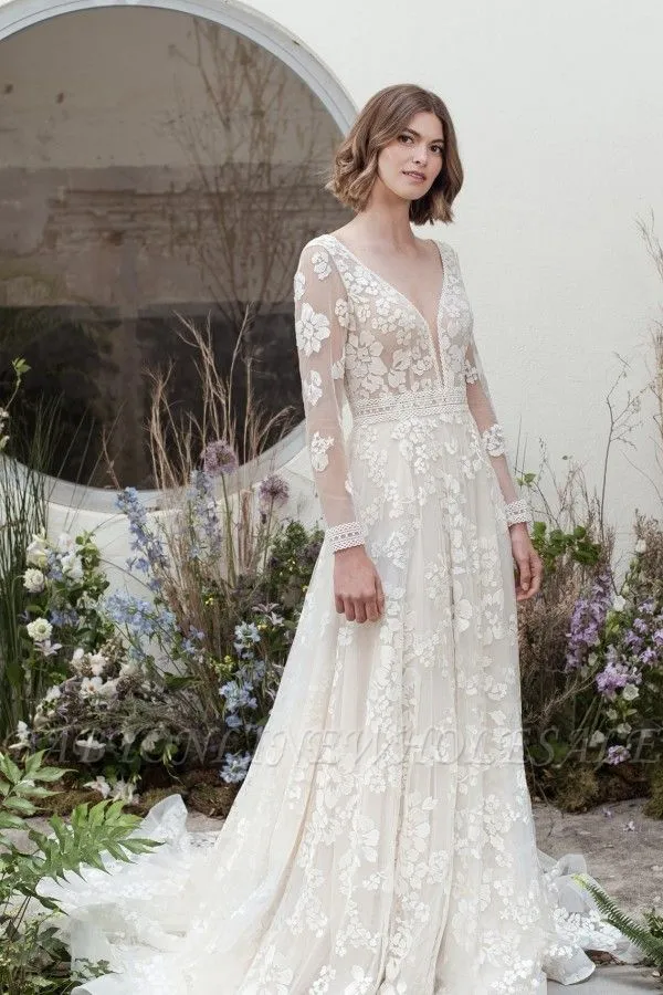 | product name | Exquisite Floor Length Sweetheart Long Sleeves A Line Hollow Lace Wedding Dress with Chapel Train |