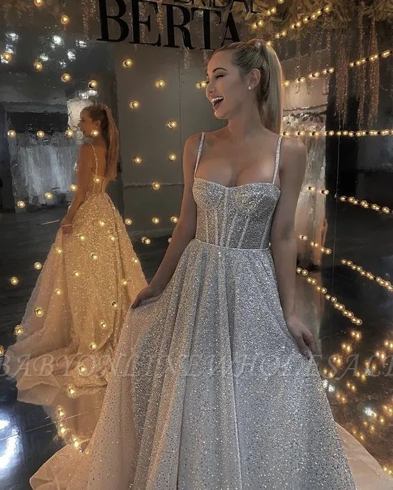 Be the first to review “Exquisite Sequined Floor Length Spaghetti Straps Sleeveless A Line With Court Train” Cancel reply