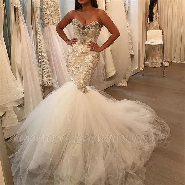 Wanna in Tulle, Mermaid style, and delicate Crystal work? Babyonlinewholesale has all covered on this elegant Glamorous Fit and Flare Tulle Wholesale Wedding Dresses | Lace Sweetheart Crystal Bridal Gowns yet cheap price.