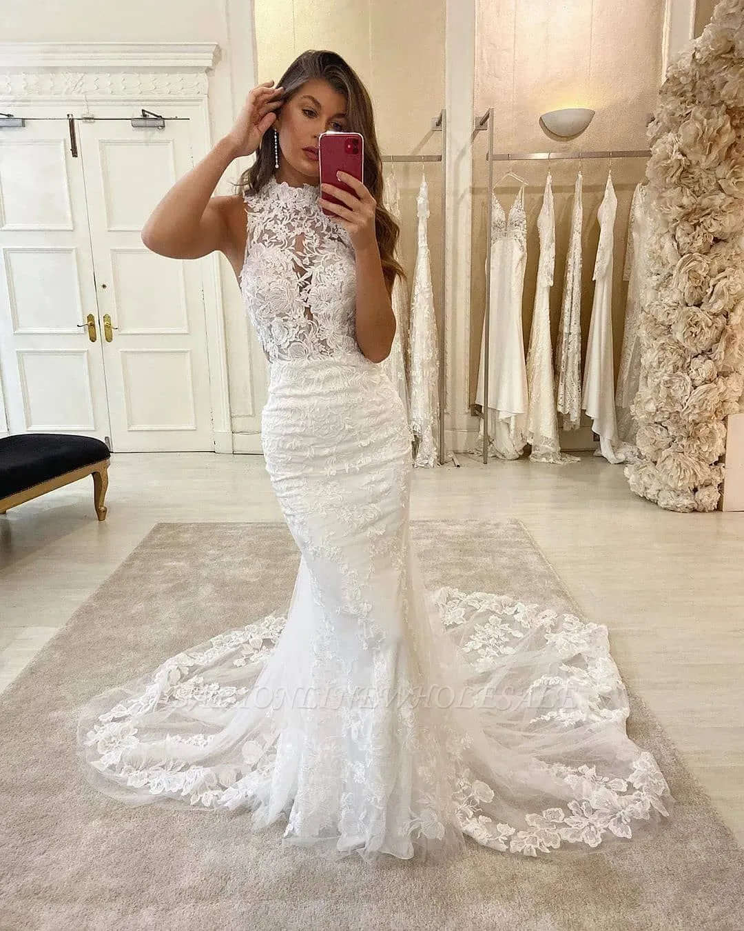 | product name | Glamorous Halter Lace Appliques Sleeveless Mermaid Wedding Bridal Gowns |