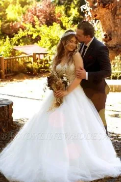 V-Neck A-line Wedding Dress Sleeveless Tulle Lace Appliques Bridal Dress