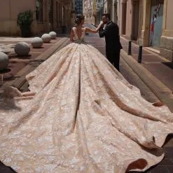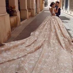 Be the first to review “Glamorous V-Neck Sleeves Floral Pattern Ball Gown Champagne Aline Wedding Gowns” Cancel reply
