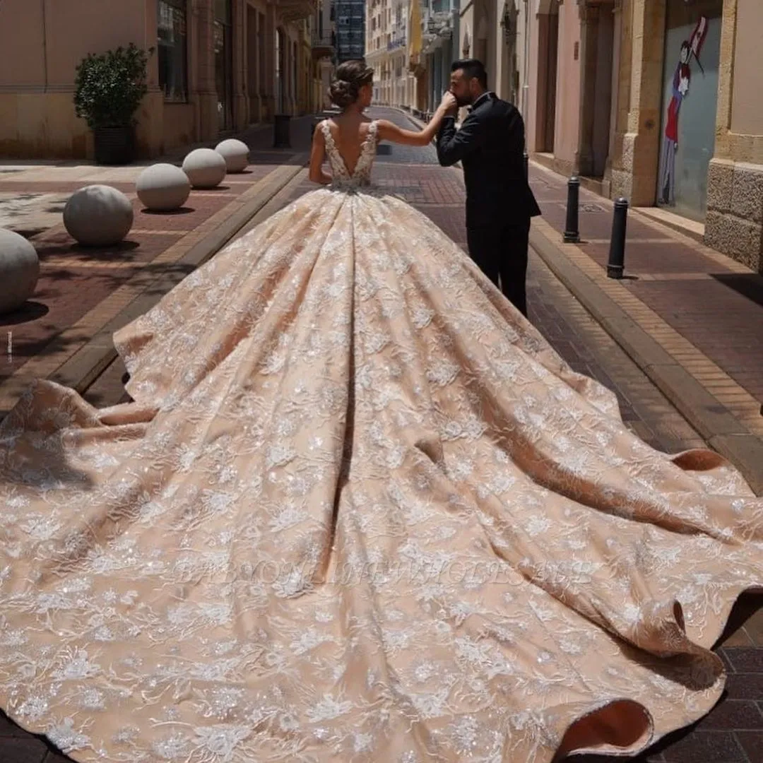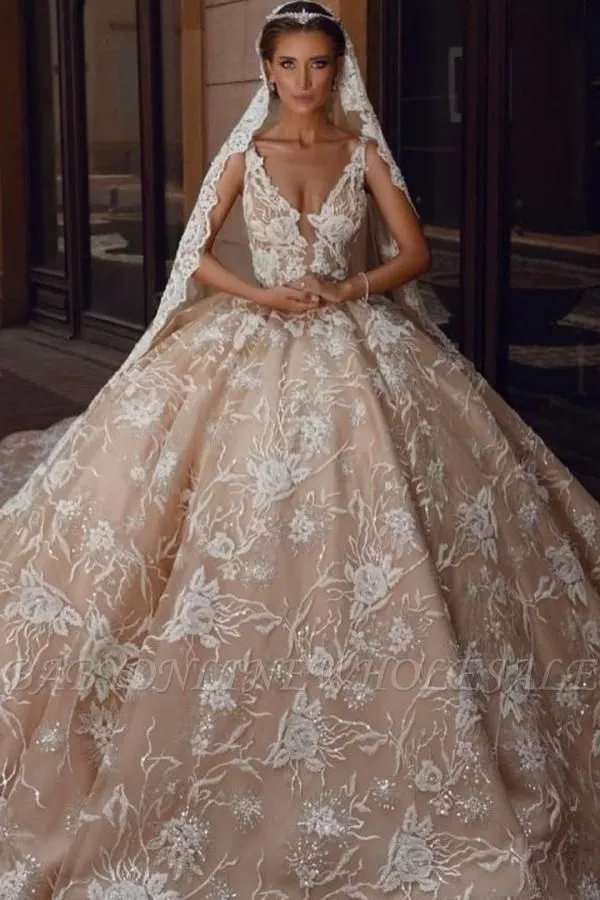 Looking for in Lace, Ball Gown style, and elegant Lace work? Babyonlinewholesale has all covered on this unique Glamorous V-Neck Sleeves Floral Pattern Ball Gown Champagne Aline Wedding Gowns.