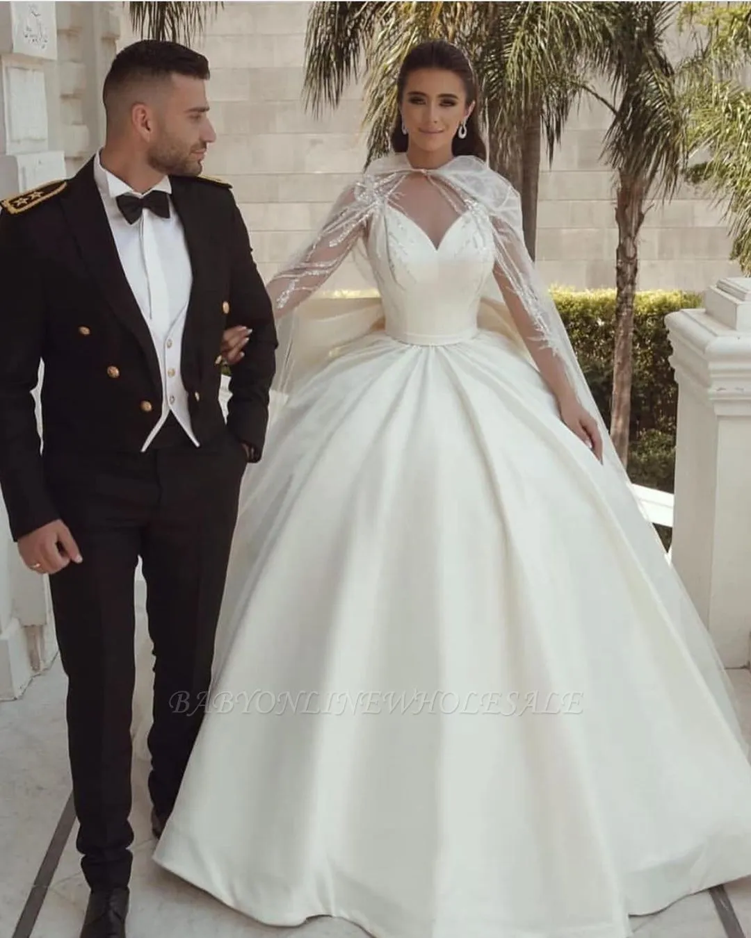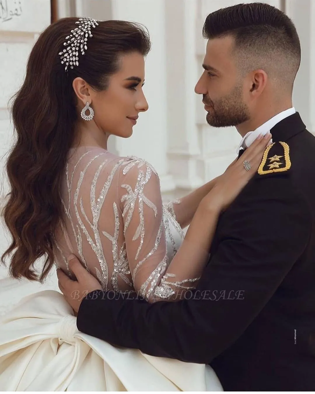 Looking for in Satin, Ball Gown style, and Gorgeous Crystal work? Babyonlinewholesale has all covered on this elegant Gorgeous Long Sleeves Satin Bridal Gown with 3D Sequins Bowtie Back.