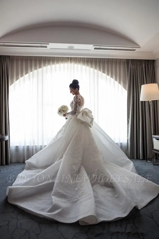 Elegant Jewel Long-Sleeves Tulle Lace Long Wedding Dress With Court Train