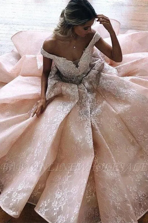 Looking for in Lace, A-line style, and elegant Lace work? Babyonlinewholesale has all covered on this unique Gorgeous Off Shoulder Floral Lace Bridal Gown with Sweep Train.