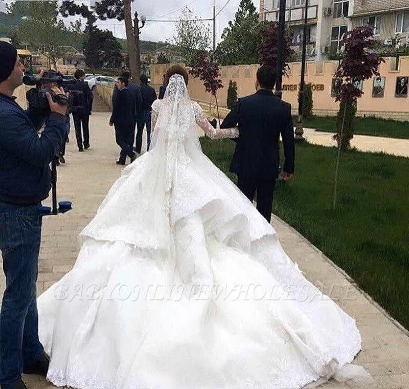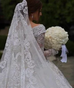 Charming White Floral Lace Tulle Plus Size Bridal Dress With Long Sleeves