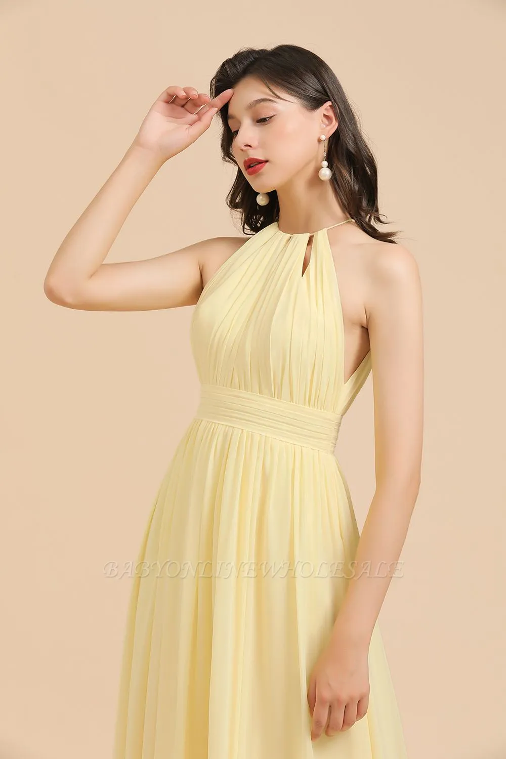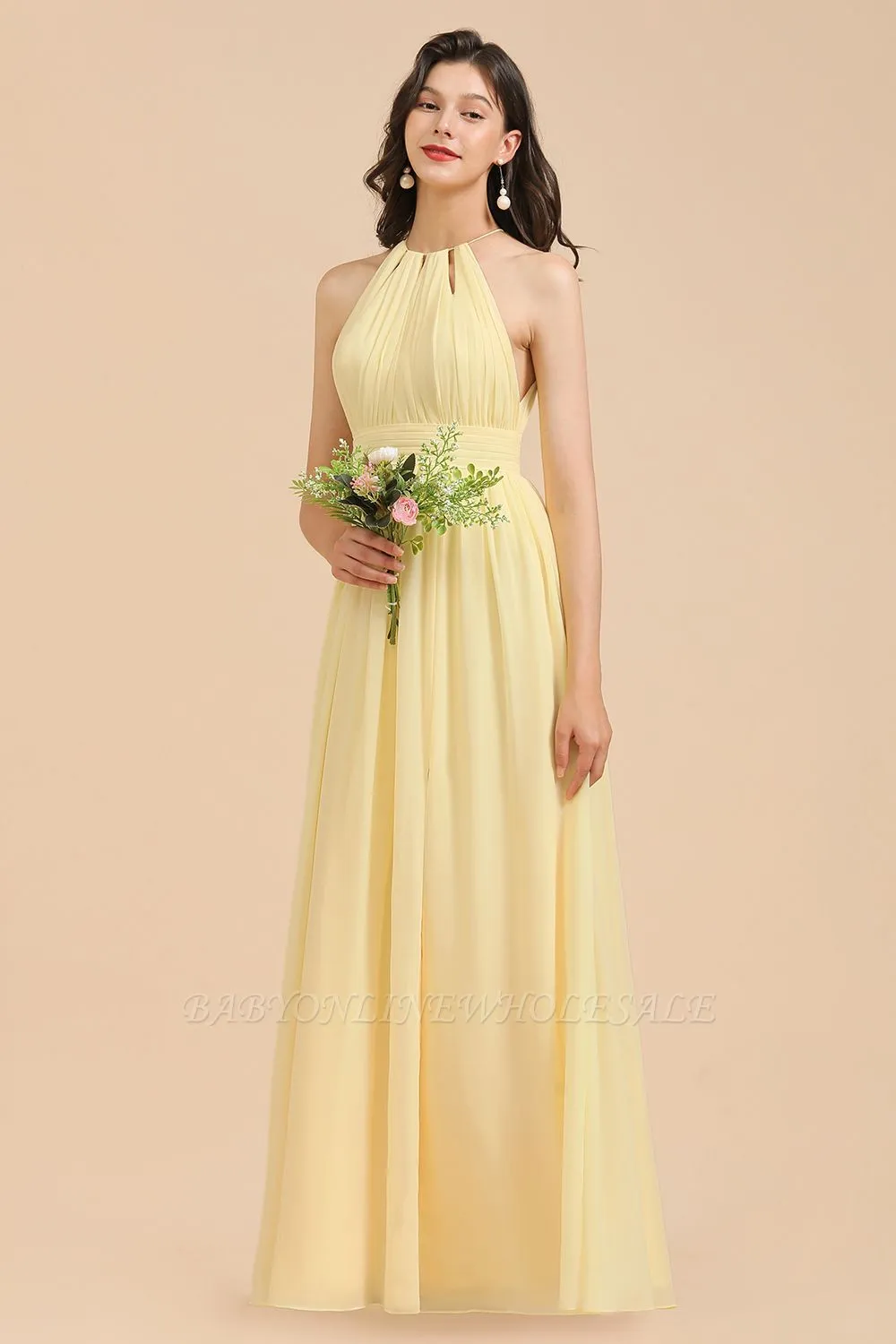 Babyonlinewholesale offers Halter Pleated Chiffon Daffodil Bridesmaid Dress Side Slit Long Wedding Party Dress at a good price from Same as Picture,White,Ivory,Blushing Pink,Candy Pink,Pearl Pink,Dusty Rose,Watermelon,Red,Fuchsia,Burgundy,Gold,Champagne,Orange,Yellow,Daffodil,Regency,Grape,Lilac,Lavender,Sky Blue,Pool,Ocean Blue,Royal Blue,Ink Blue,Dark Navy,Black,Silver,Dark Green,Jade,Green,Sage,Mint Green,Dusty Blue,Dusty Sage,Orchid,Wisteria,Coral,Rust,Emerald,Vintage Mauve,100D Chiffon to A-line Floor-length them. Stunning yet affordable Sleeveless Bridesmaid Dresses.