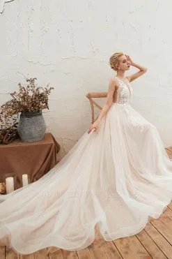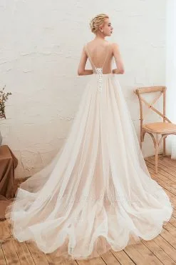 | product name | Illsuion neck Champange Wedding Dress with Chapel Train, Sleeveless Summer Bridal Gowns Online |
