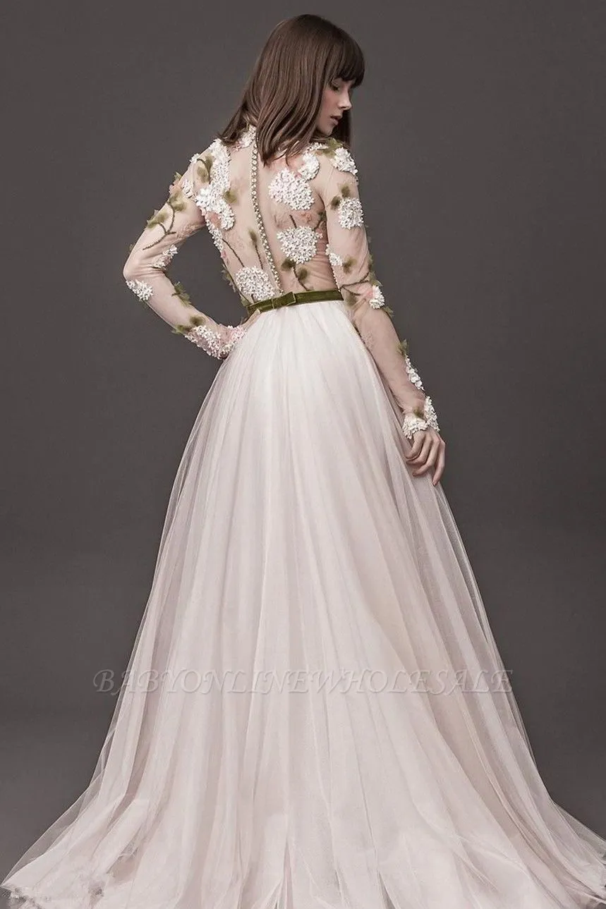 | product name | Lace Long Sleeve Floral A-line Wedding Dresses, Pleated Tulle Bridal Gowns Online |