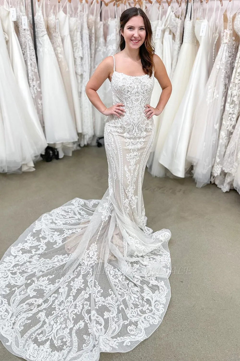 Buy you Long Mermaid Spaghetti Straps Backless Appliques Lace Floor-length Wedding Dress online with babyonlinewholesale.com