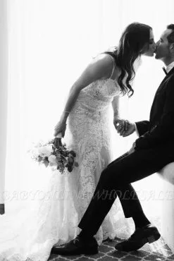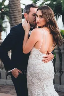 The gorgeous Low back white column white lace wedding dress with court train will stun every girl. The Lace dress will add extra elegance to your wholesale look.