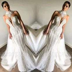 | product name | Luxurious High Neck Mermaid Sleeveless Wedding Dress, 2021 Lace Appliques Overskirt Bridal Gown BC0672 |