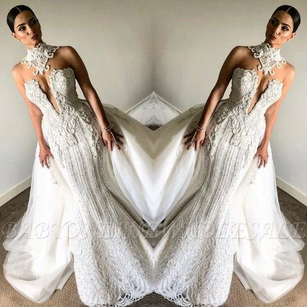 Looking for in , Mermaid style, and Gorgeous Appliques work? Babyonlinewholesale has all covered on this elegant Luxurious High Neck Mermaid Sleeveless Wedding Dress|2021 Lace Appliques Overskirt Bridal Gown BC0672.