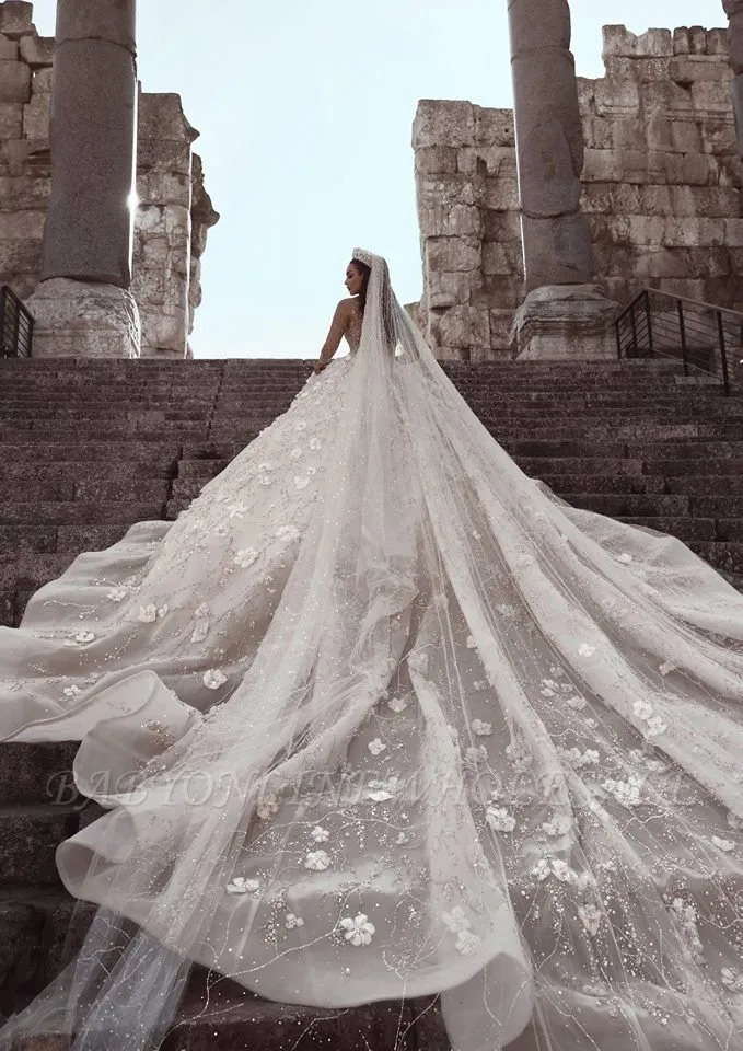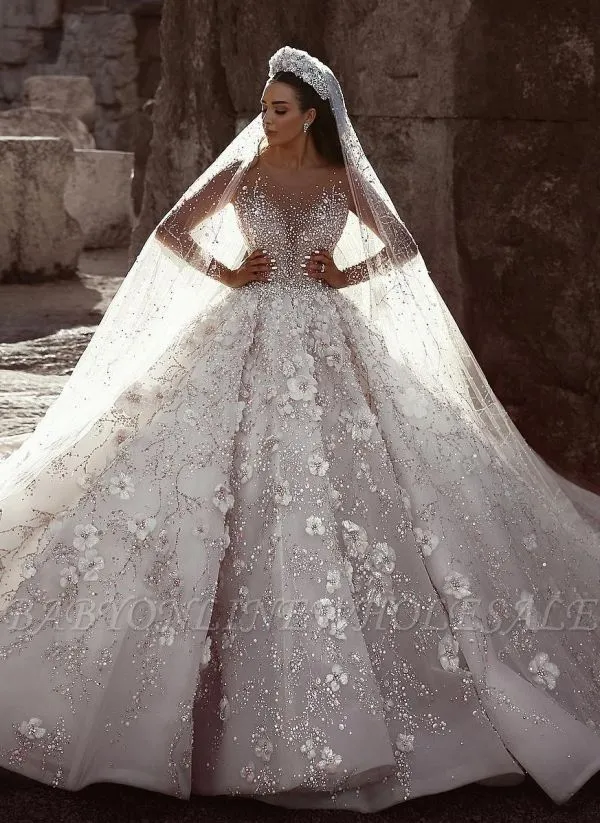 Luxury Beading Floral Bridal Gowns, Sheer Neck Long Sleeves Ball Gown Wedding Dresses. Free shipping, high quality, fast delivery, made to order dress. Discount price. Affordable price. Yesbabyonline