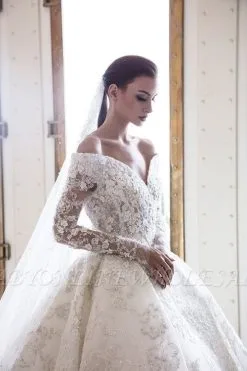 | product name | Luxury Off Shoulder Long Sleeves White Lace Ball Gown with Cathedral Train |