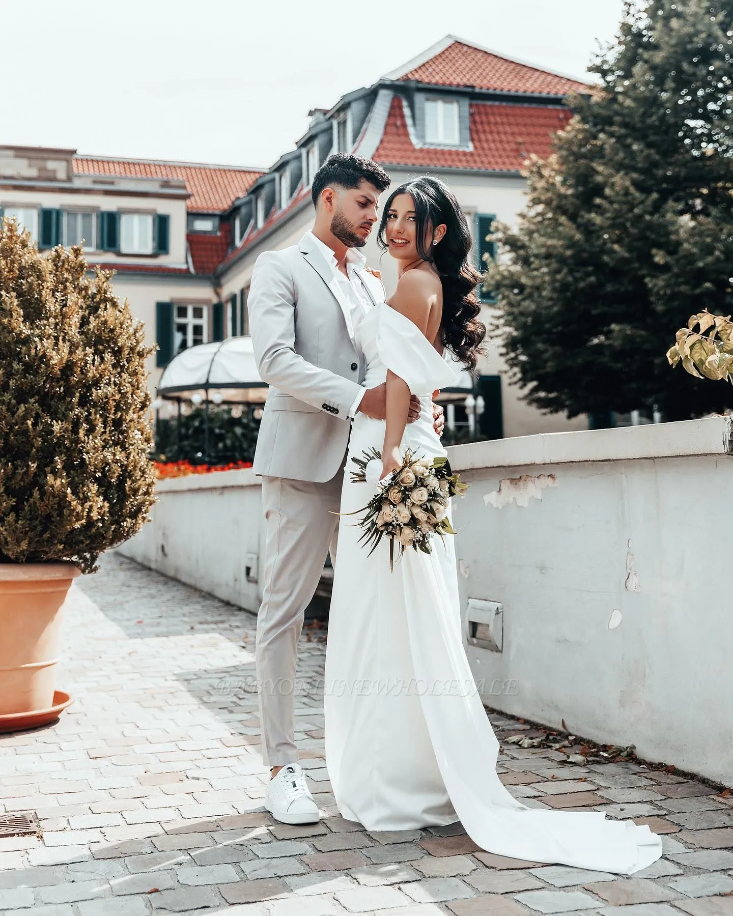 Be the first to review “New Charming Off-the-shoulder Sleeveless Sheath Satin Ruffle Wedding Dress With Sweep Train” Cancel reply