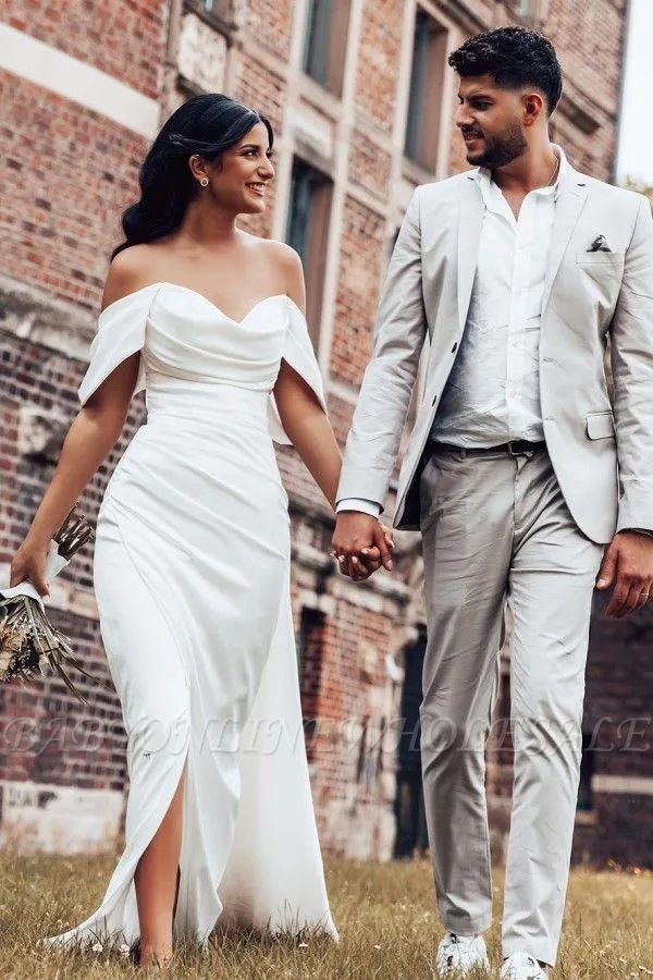 Buy you New Charming Off-the-shoulder sleeveless Sheath Satin Ruffle Wedding Dress with Sweep Train online with babyonlinewholesale.com