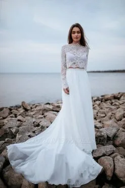 Stunning White Floral Chiffon Wedding Dress Long Sleeves Beach Bridal Dress