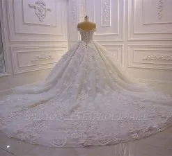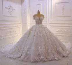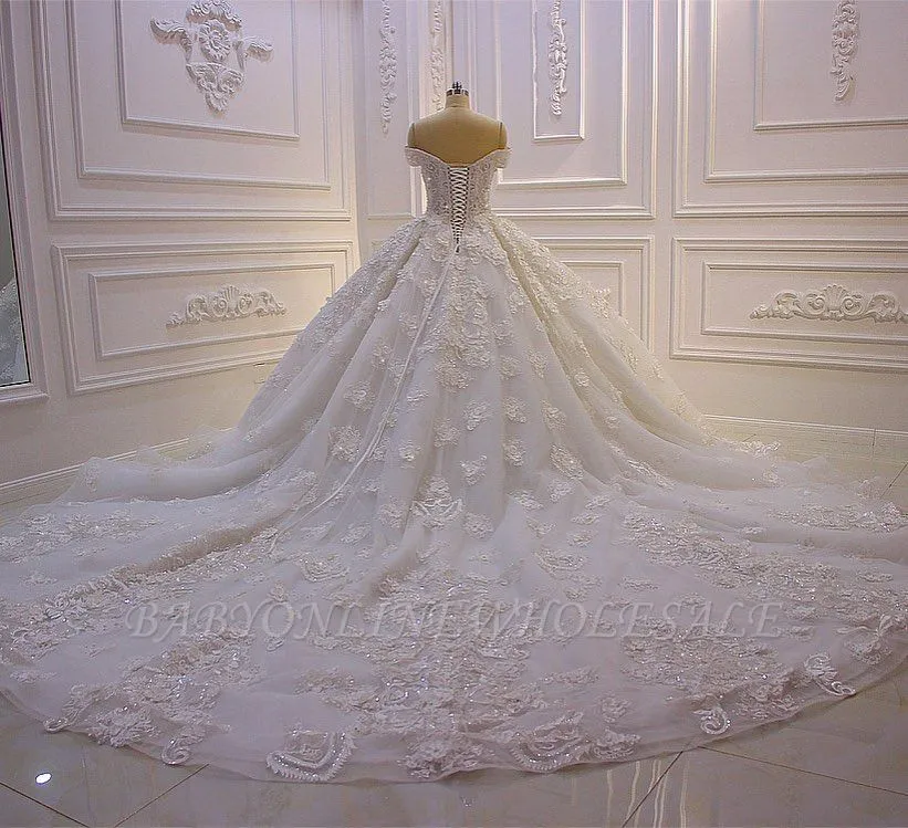| product name | Off Shoulder 3D Floral Appliques Ball Gown with Cathedral Gown |
