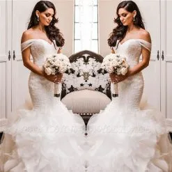 Be the first to review “Off The Shoulder Puffy Ruffles Wedding Dresses | Sheath Tulle Sexy Lace Bridal Gowns” Cancel reply