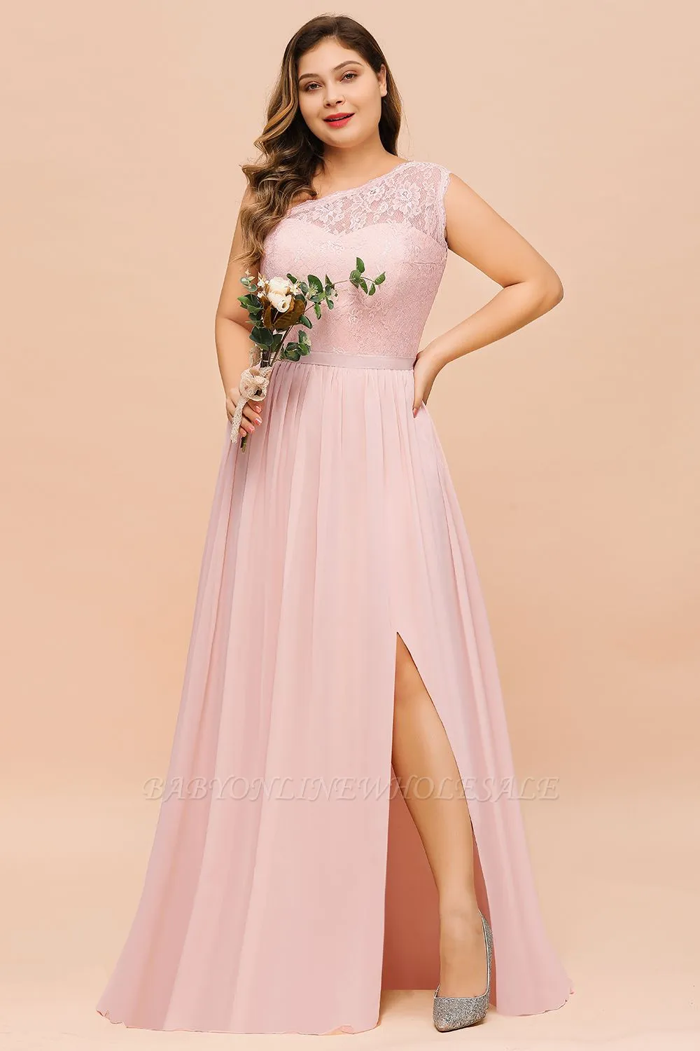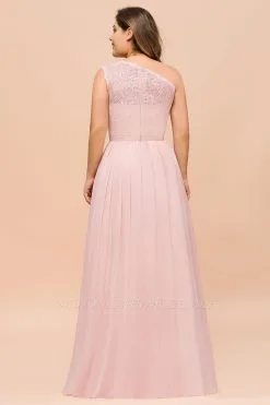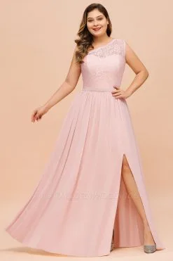 | product name | One shoulder Lace Aline Evening Dress Pink Bridesmaid Dress with Side Slit |