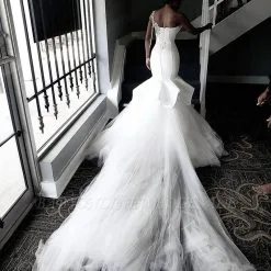 Gorgeous White Ruffle Sleeves Tulle Lace Appliques Mermaid Wedding Dress