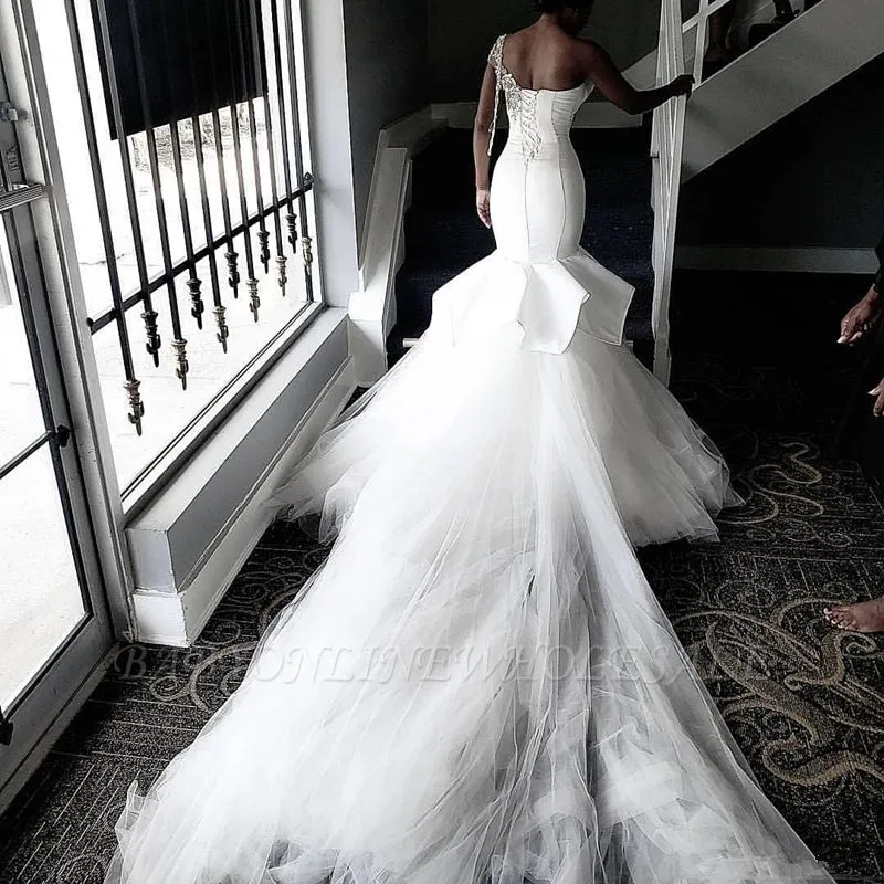 | product name | One shoulder White Mermaid Bridal Gowns with Ruffle Train |