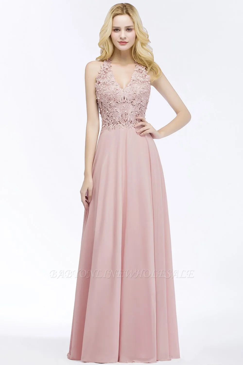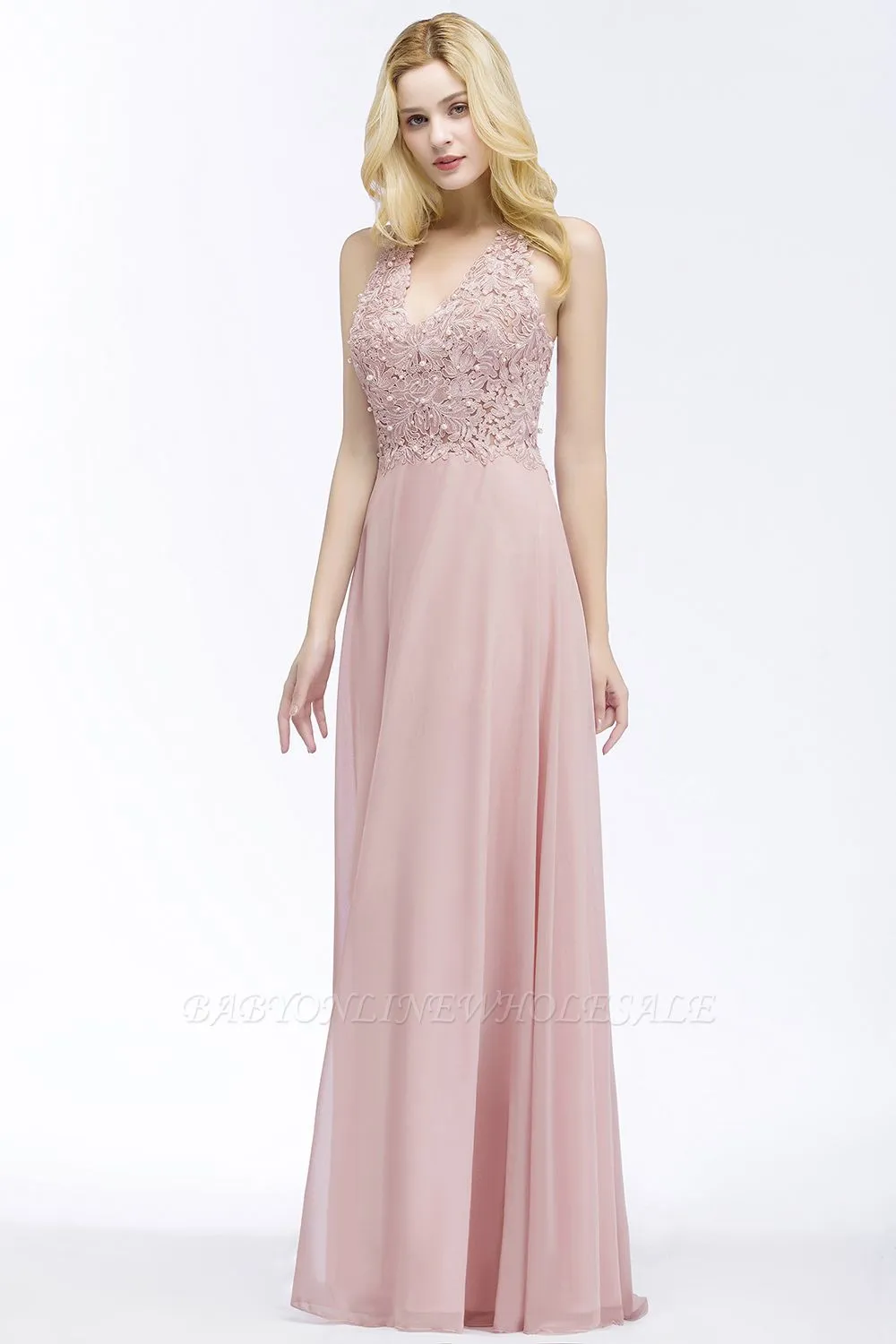 Looking for Bridesmaid Dresses in 30D Chiffon, A-line style, and Gorgeous Appliques,Pearls work? Babyonlinewholesale has all covered on this elegant PAM | A-line V-neck Sleeveless Long Appliques Chiffon Bridesmaid Dresses.