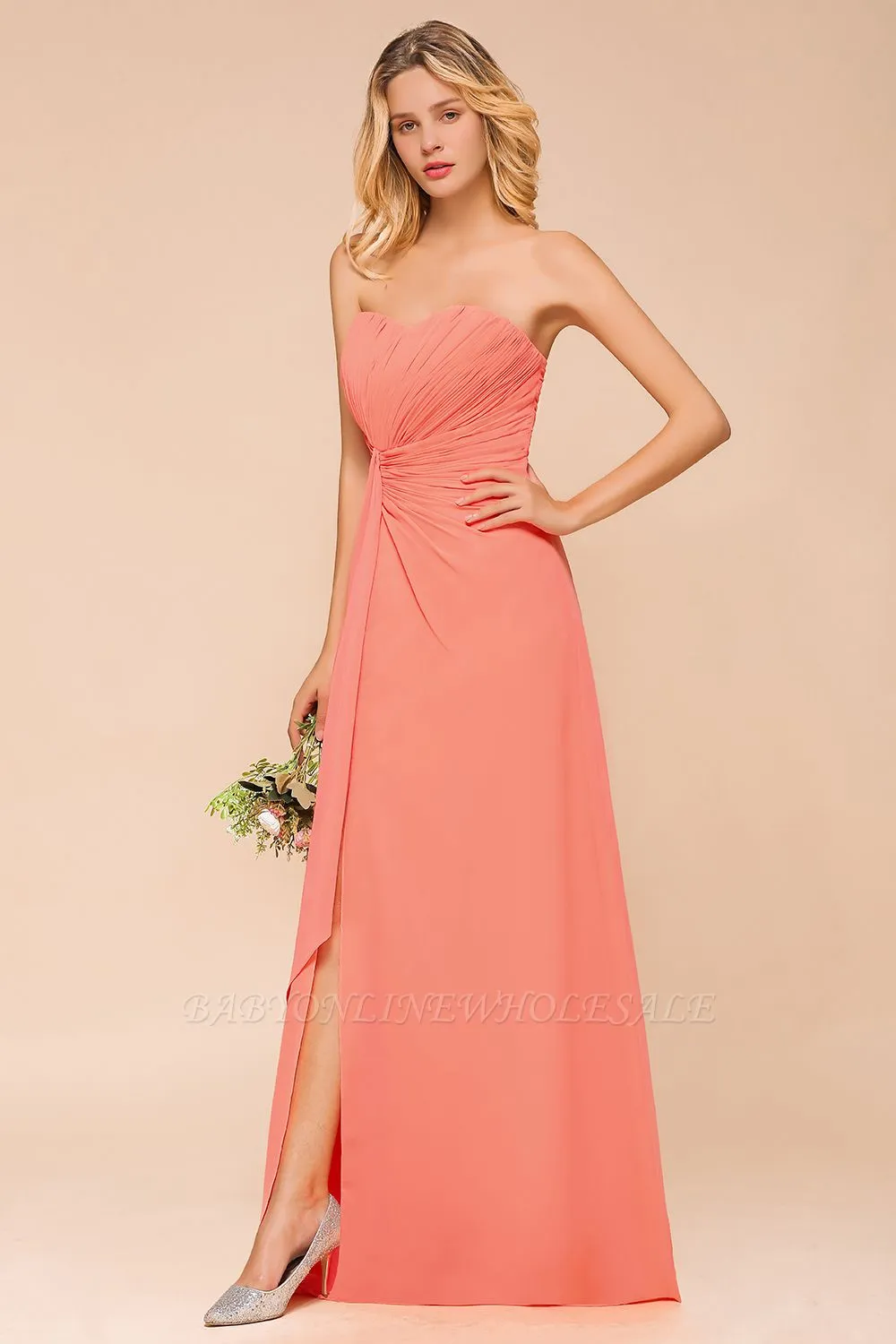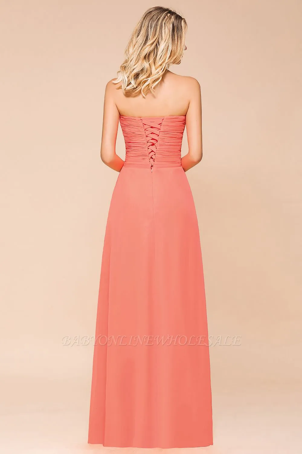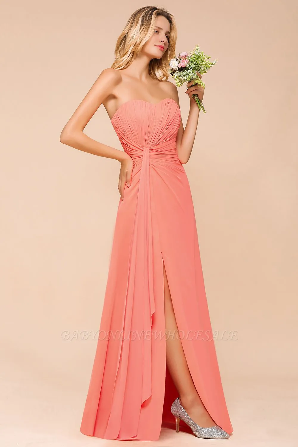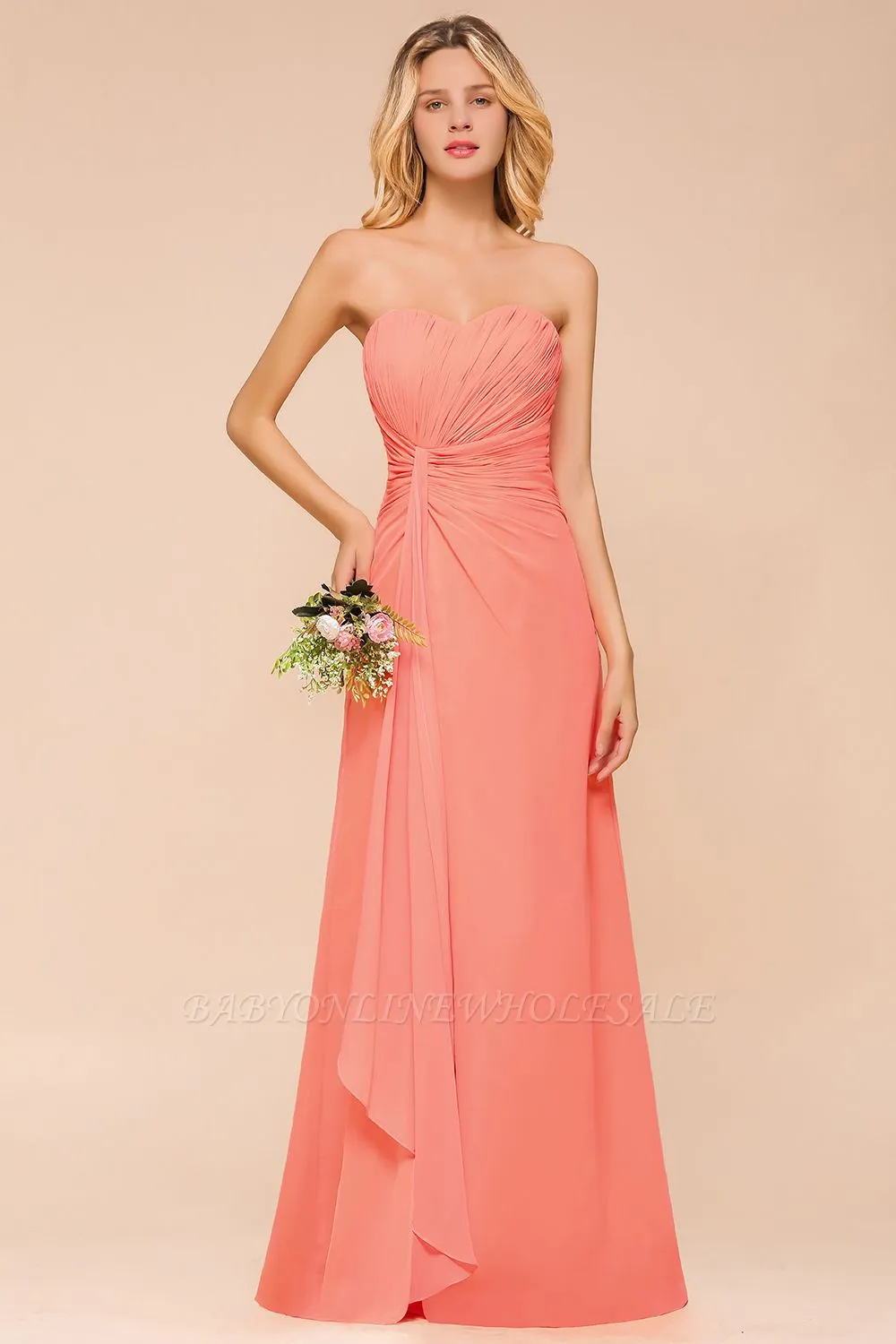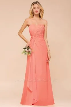 The gorgeous Peach Sweetheart Ruffle Chiffon Slim Mermaid Bridesmaid Dress will stun every girl. The 100D Chiffon dress will add extra elegance to your wholesale look.