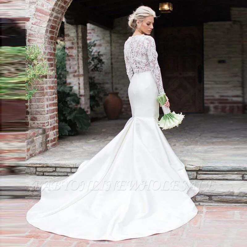 Sweetheart Ivory Unique Lace Mermaid Buttons Satin Wedding Dresses