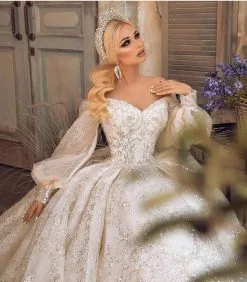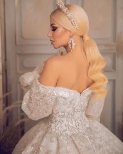 Be the first to review “Romantic Off Shoulder Puffy Sleeve Beadings Princess Ball Gown With Cathedral Train” Cancel reply