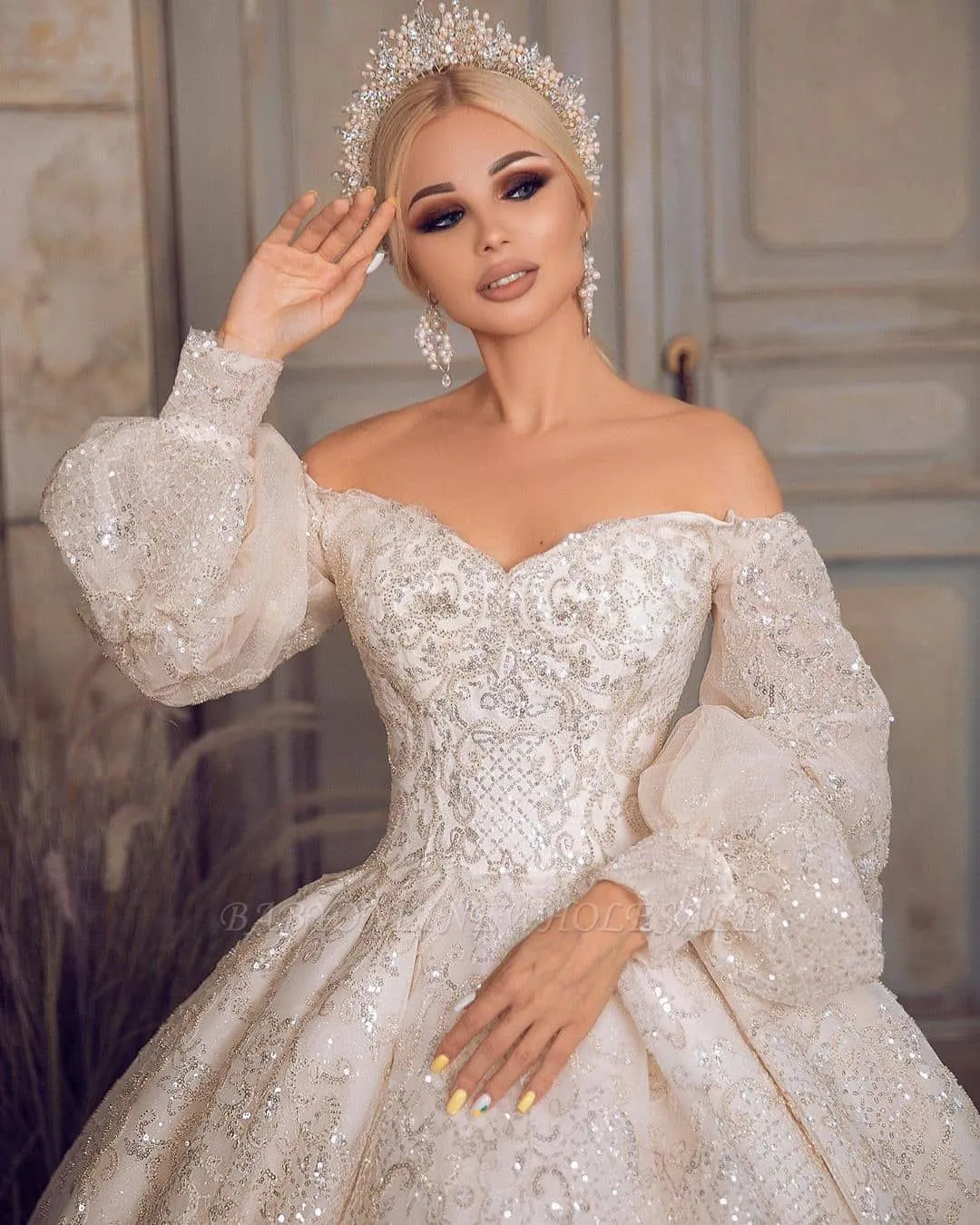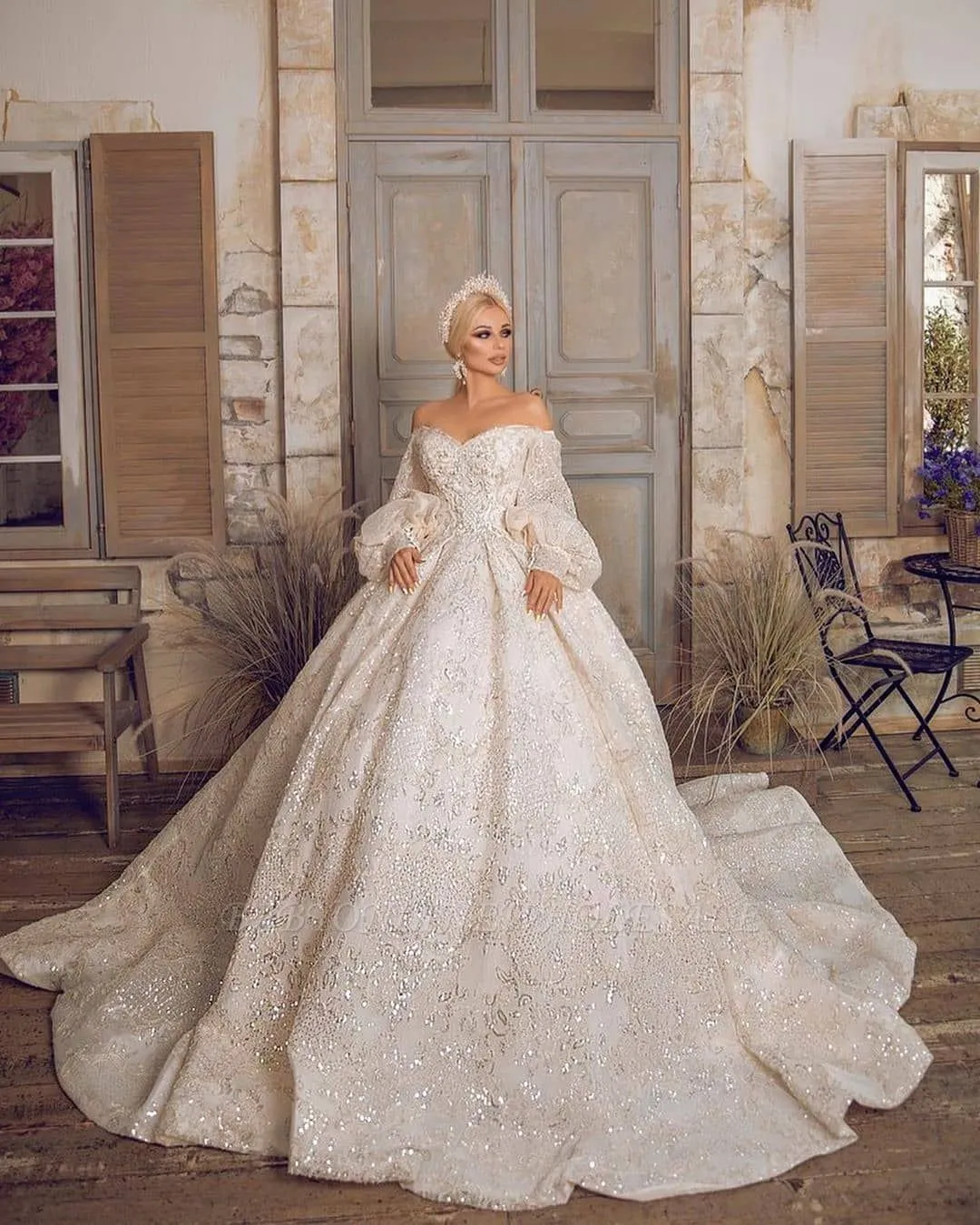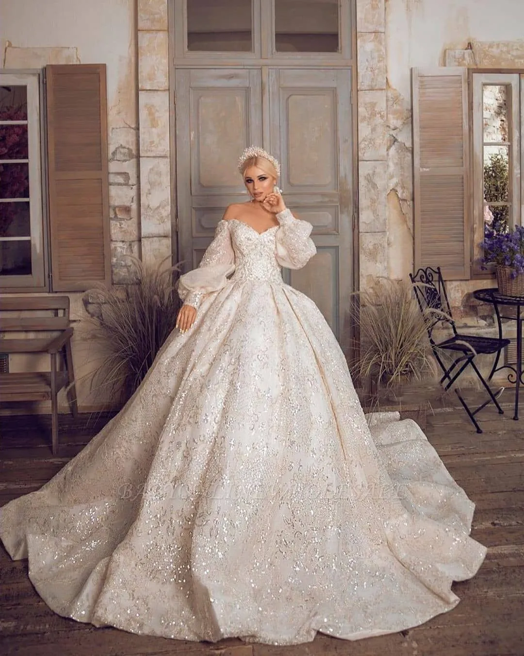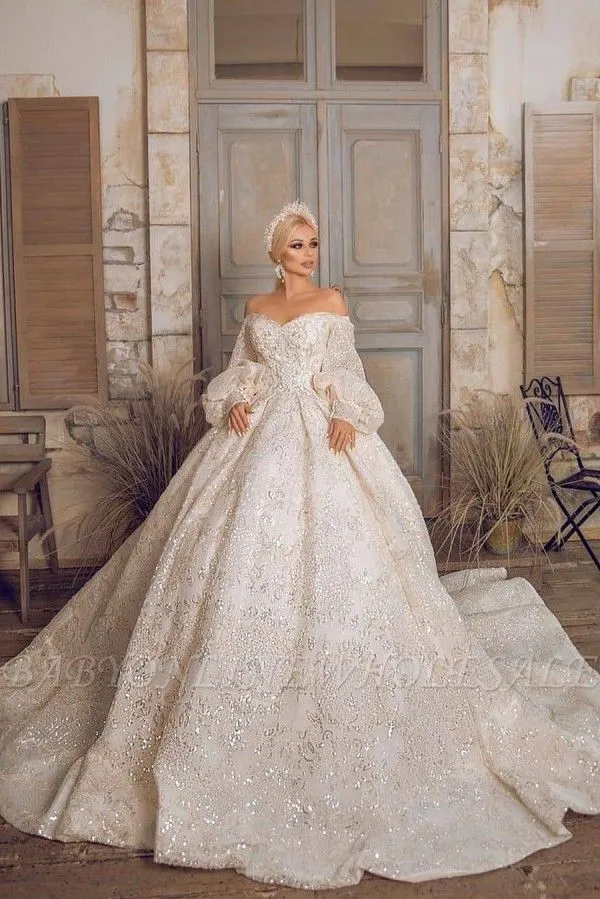 Looking for in Sequined, Ball Gown style, and Gorgeous Lace,Ruffles work? Babyonlinewholesale has all covered on this elegant Romantic Off Shoulder puffy Sleeve Beadings Princess Ball Gown with Cathedral Train.