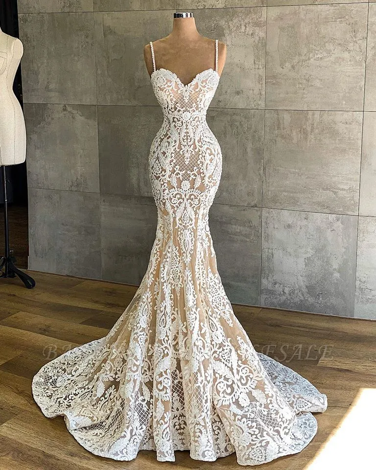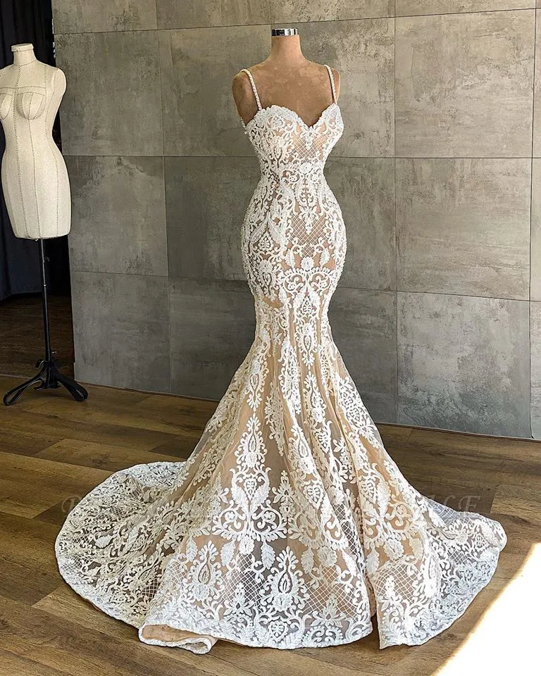 | product name | Romantic Spaghetti Straps Sweetheart Mermaid Bridal Dress with Floral Lace Pattern |
