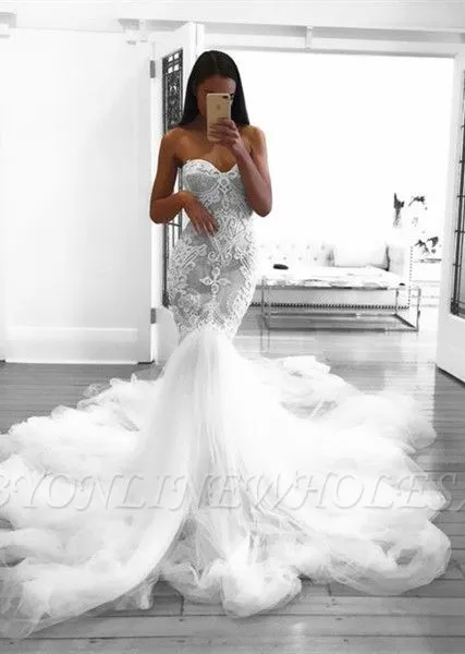 Babyonlinewholesale custom made Romantic Sweetheart Lace White Sheer Wedding Dress | Mermaid Bridal Gown
