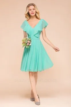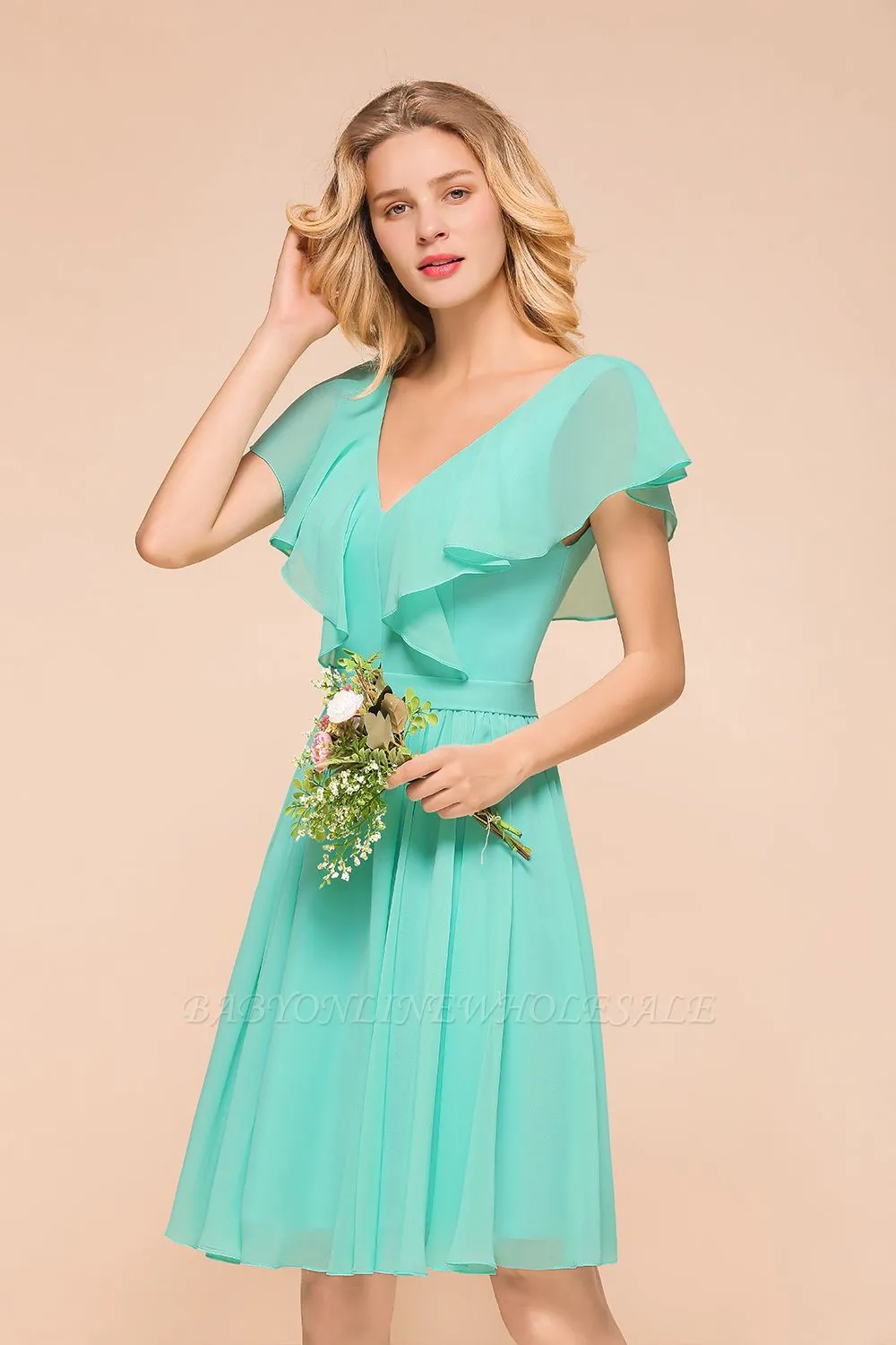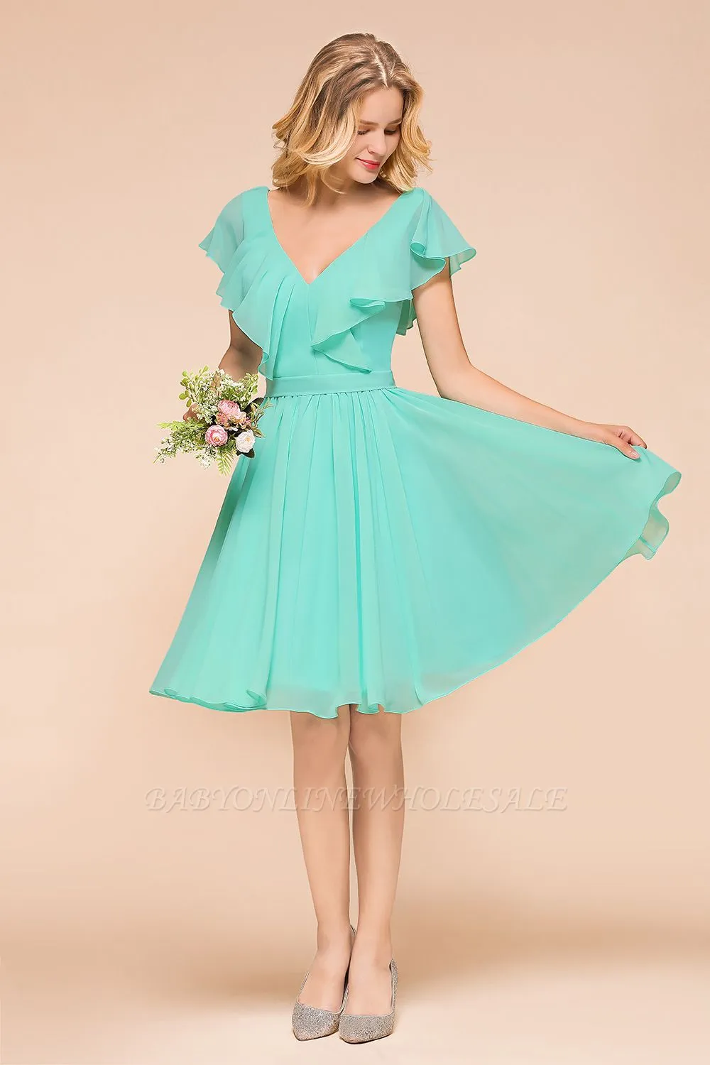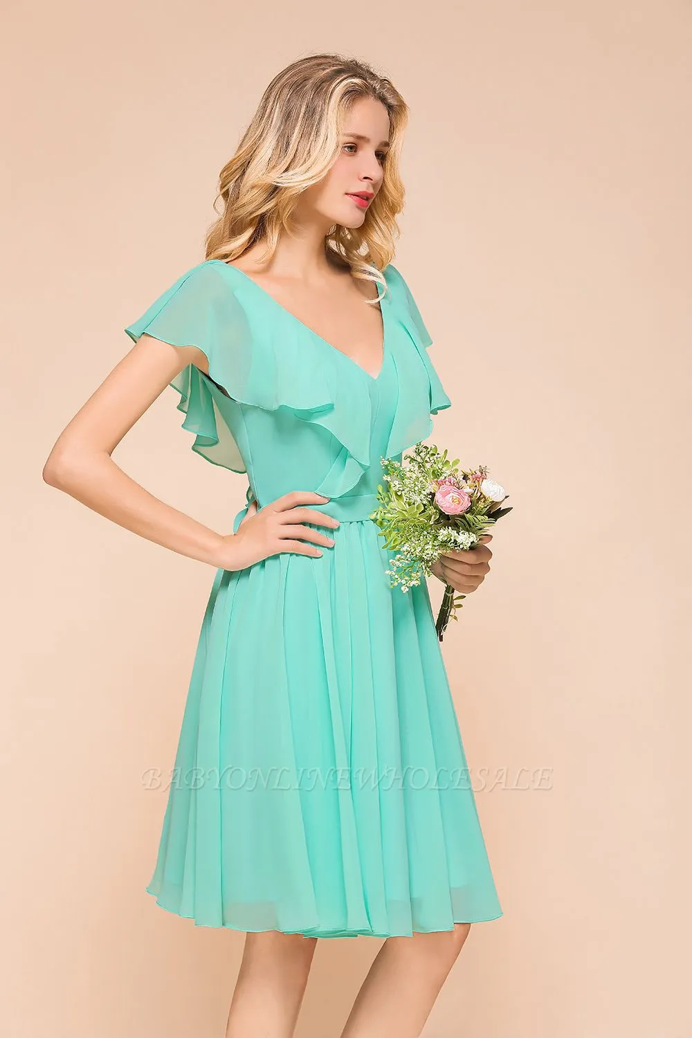 Looking for Bridesmaid Dresses in 100D Chiffon, A-line style, and Gorgeous Ruffles work? Babyonlinewholesale has all covered on this elegant Ruffle Sleeves Short Party Dress Mint Green Chiffon Knee Length Dress.