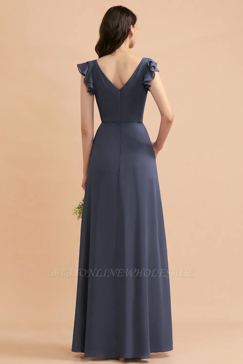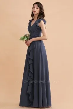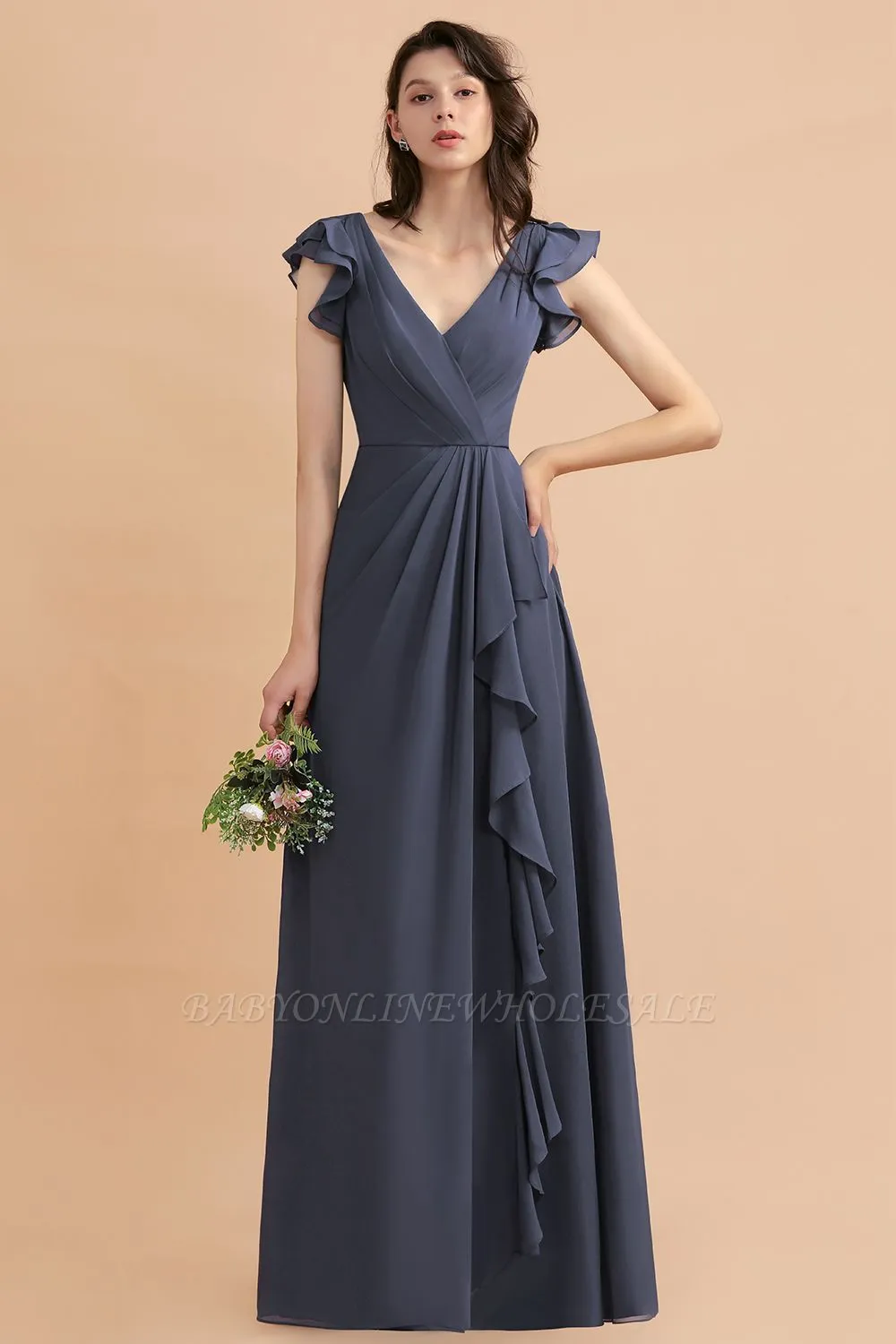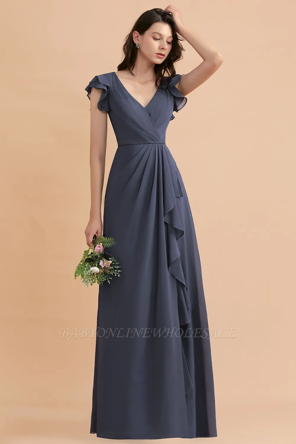 Looking for Bridesmaid Dresses in 100D Chiffon, A-line style, and Gorgeous Pockets work? Babyonlinewholesale has all covered on this elegant Ruffles Sleeves Chiffon Aline Wedding Party Dress Floor Length Evening Dress.