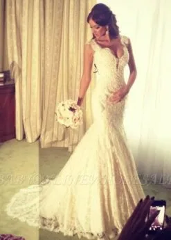V-neck Sleeveless Mermaid Wedding Dresses Sexy Lace Appliques Bridal Gown WE0196