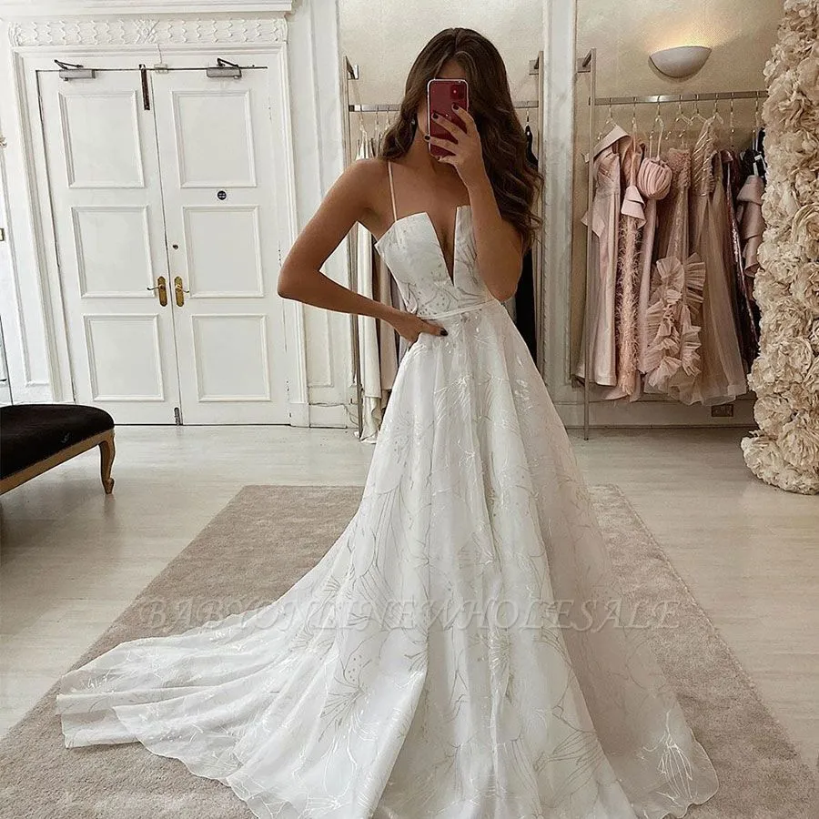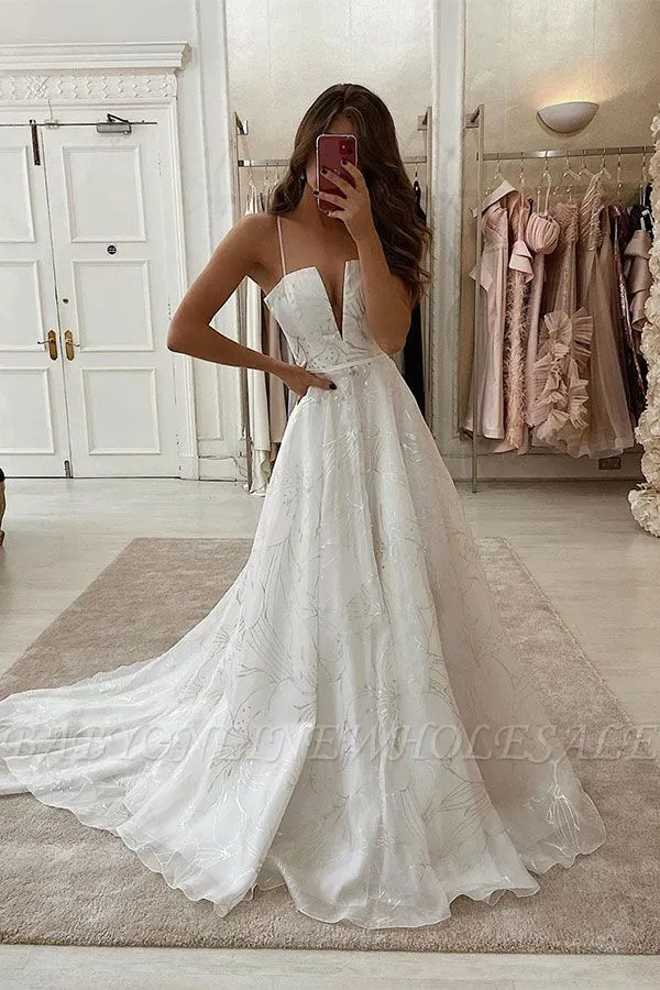 Babyonlinewholesale offers Sexy Spaghetti Strap V-neck White Unique design Wedding Dress online at an affordable price from Satin,Tulle to skirts. Shop for gorgeous Sleeveless collections for your big day.