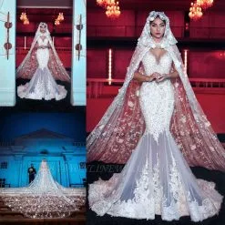Luxury 3D Lace Applique High Neck Tulle Mermaid Wedding Dress