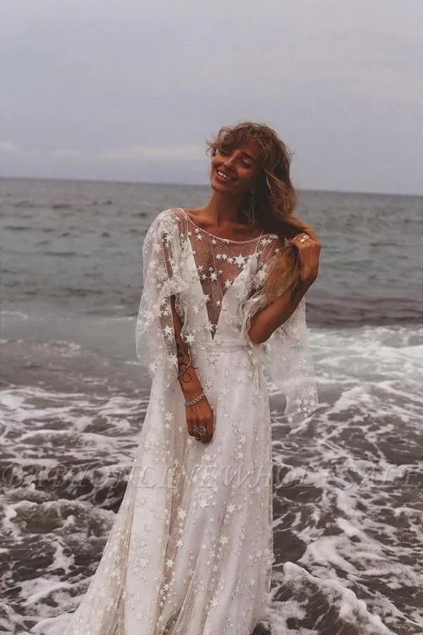 Babyonlinewholesale offers Simple Puffy Sleeves Evening Dress Scoop Neck Star Pattern Aline Bridal Dress at a good price from Same as Picture,White,Ivory,Champagne,Black,Lace to A-line Floor-length them. Stunning yet affordable Long Sleeves .