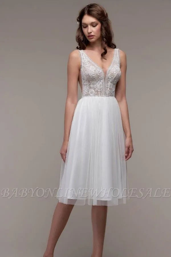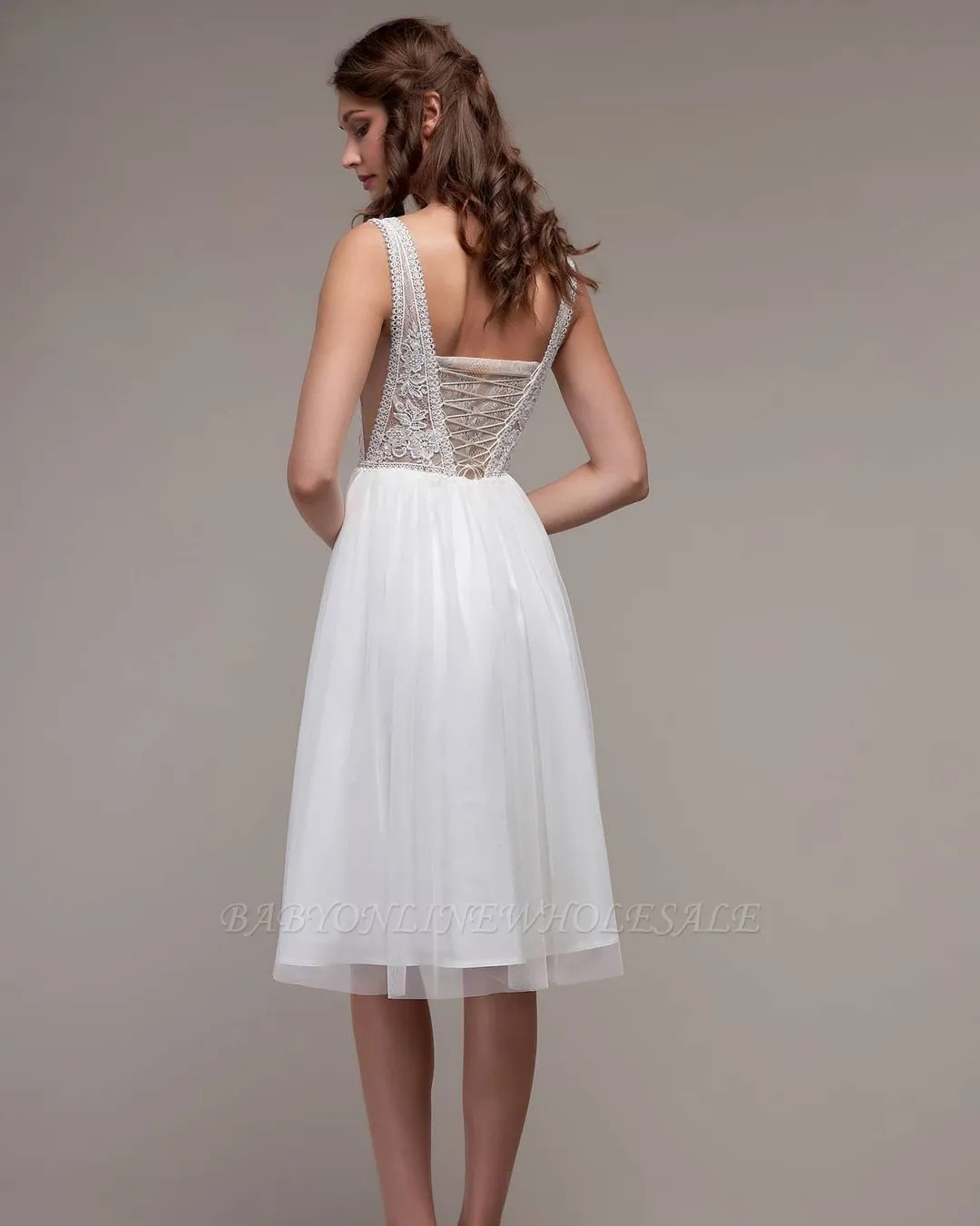 The gorgeous Simple V-Neck Sleeveless Short Wedding Dress Sheath Midi Dress for Women will stun every girl. The Tulle dress will add extra elegance to your wholesale look.
