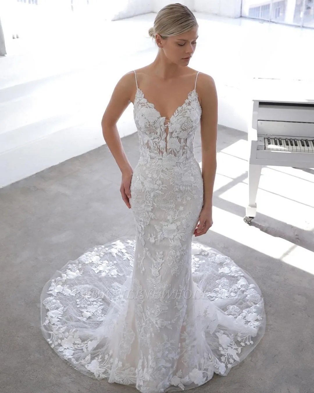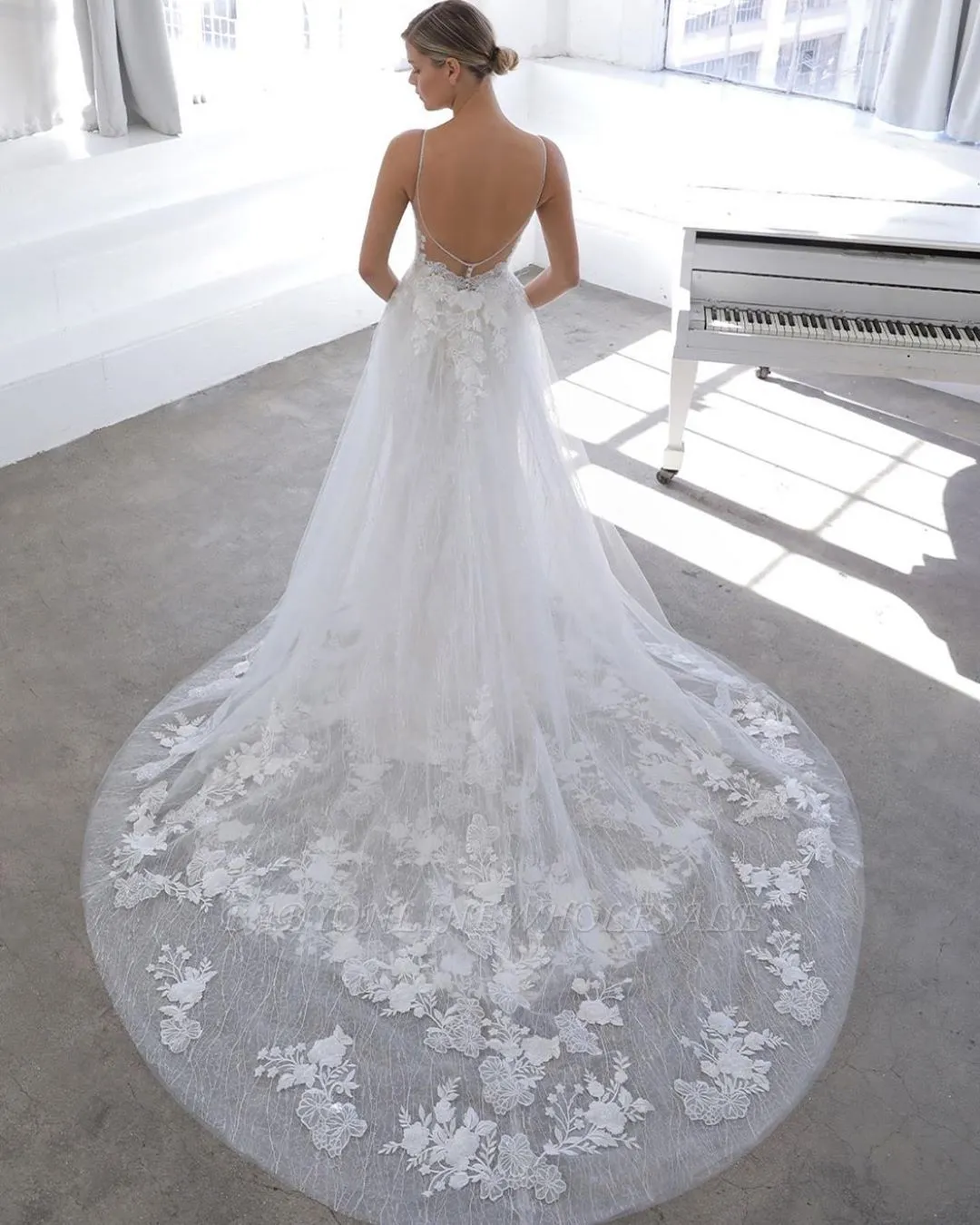 Babyonlinewholesale offers Spaghetti Strap See-through Lace Column Long Wedding dress with Tulle Overskirt online at an affordable price from Tulle,Lace to Column Floor-length skirts. Shop for gorgeous Sleeveless collections for your bridal party.