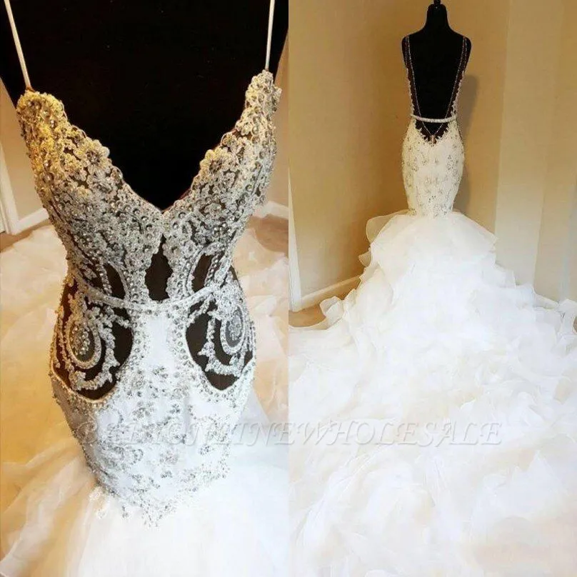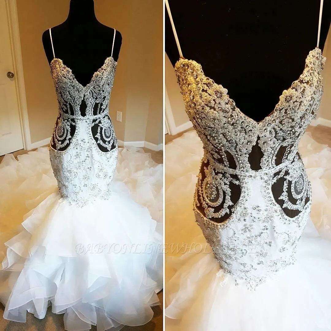 Sexy Straps Mermaid Appliques Wedding Dresses Ruffles Bridal Gown