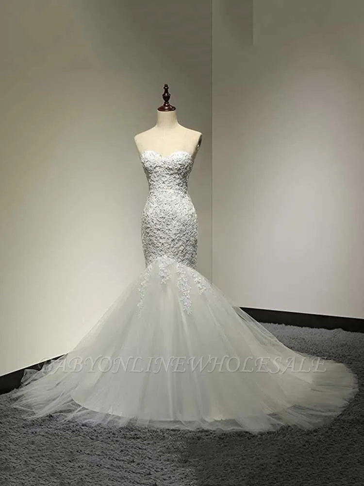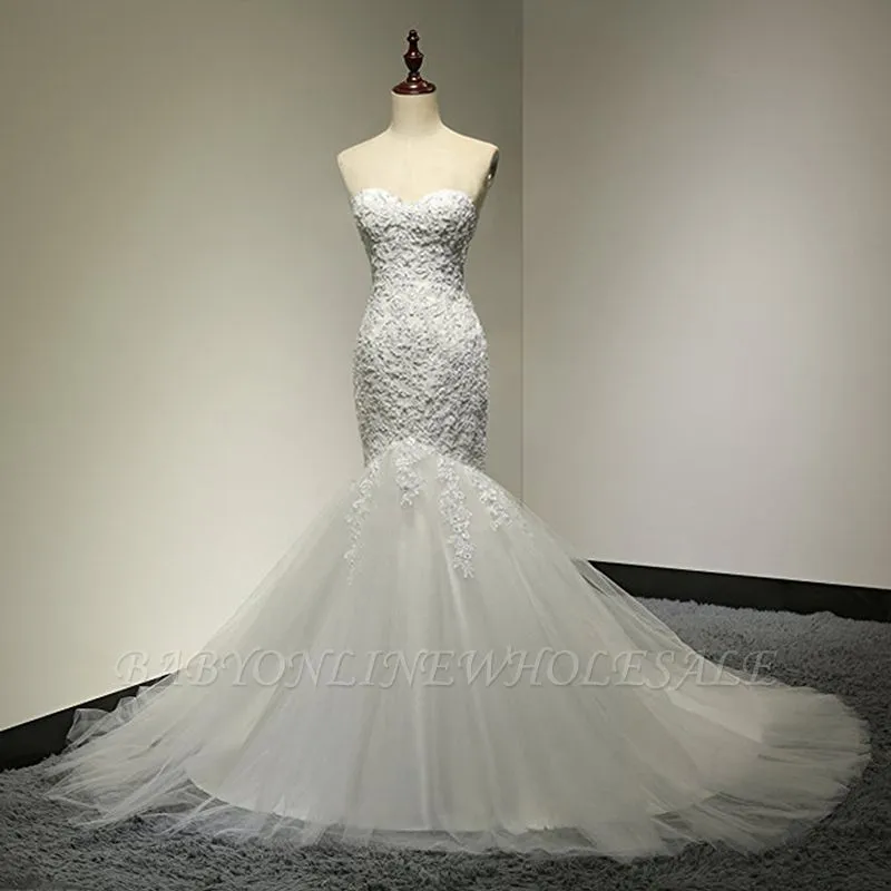 Affordable Strapless Tulle Lace Wedding Dress | Chic Mermaid Sleeveless Long Dress For Wedding