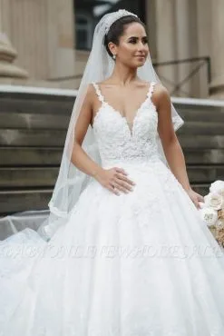 | product name | Straps V-neck white tulle ball gown wedding dress |