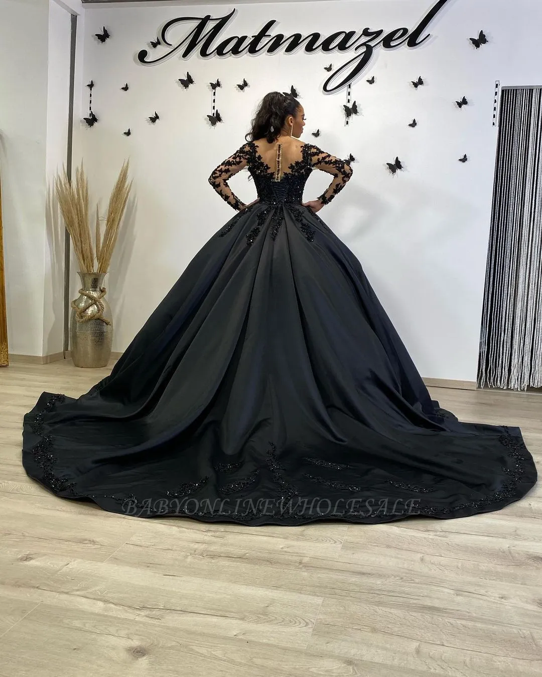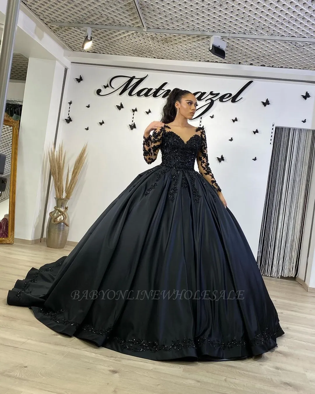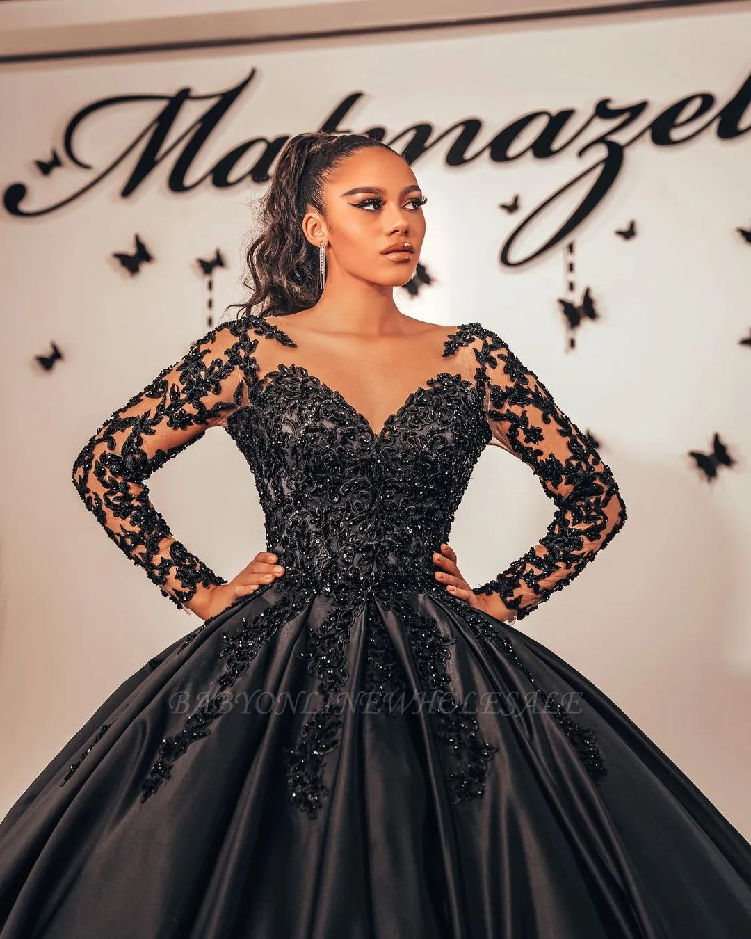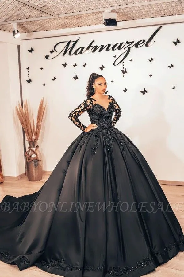 Babyonlinewholesale offers Stunning Black Lace Ball Gown Long Sleeves Floral Dancing Party Dress with Sweep Train at a good price from Same as Picture,White,Ivory,Champagne,Black,Satin to Ball Gown them. Stunning yet affordable Long Sleeves .