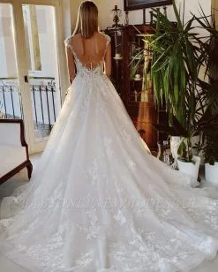 V-Neck A-line Wedding Dress Sleeveless Tulle Lace Appliques Bridal Dress